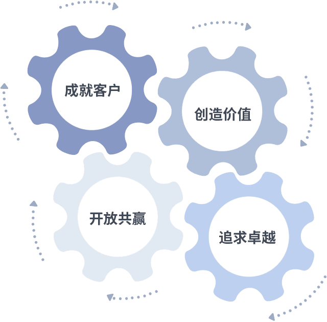成就客户是一切决策的出发点,,创造价值是衡量所有工作的标准,,追求卓越是我们做事做人的态度,,,开放共赢是我们的格局也是最终的结果。。。。价值观的齿轮环环相扣,,,,推动着组织里的每个人不断向前。。。。